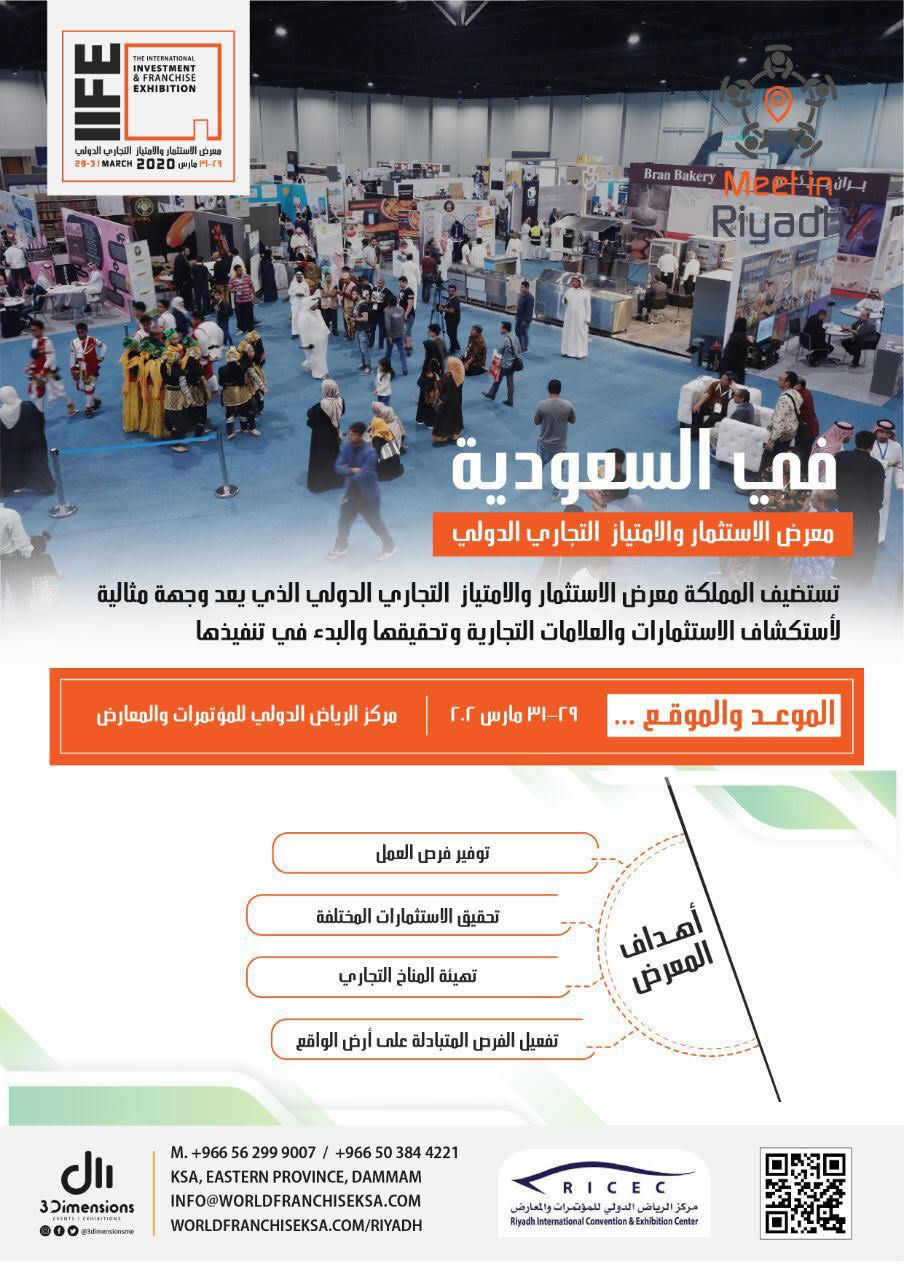 ينطلق بنهاية مارس الجاري بمدينة الرياض بالفترة من ٢٩-٣١ مارس فعاليات معرض الإستثمار والإمتياز التجاري الدولي والذي تنظمه الأبعاد الثلاثة بعد انتهاء ثلاث نسخ دولية على مستوى المدينة المنورة والمنطقة الشرقية .