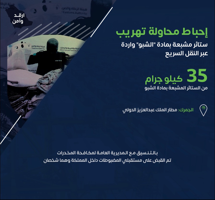 تمكنت هيئة الزكاة والضريبة والجمارك في مطار الملك عبدالعزيز الدولي بجدة من إحباط محاولة تهريب 35 كيلوجرام من الستائر المشبعة بمادة “الشبو”.