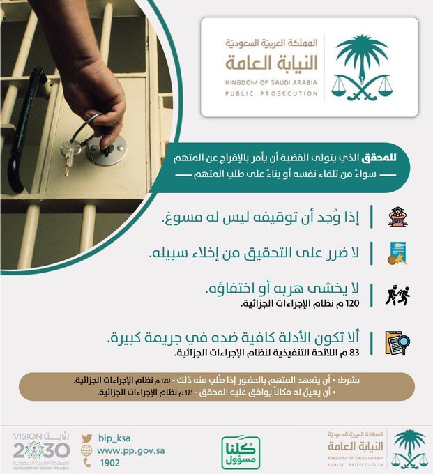 النيابة العامة تبيّن الحالات التى يجوز فيها للمحقق أن يأمر بالافراج عن المتهم