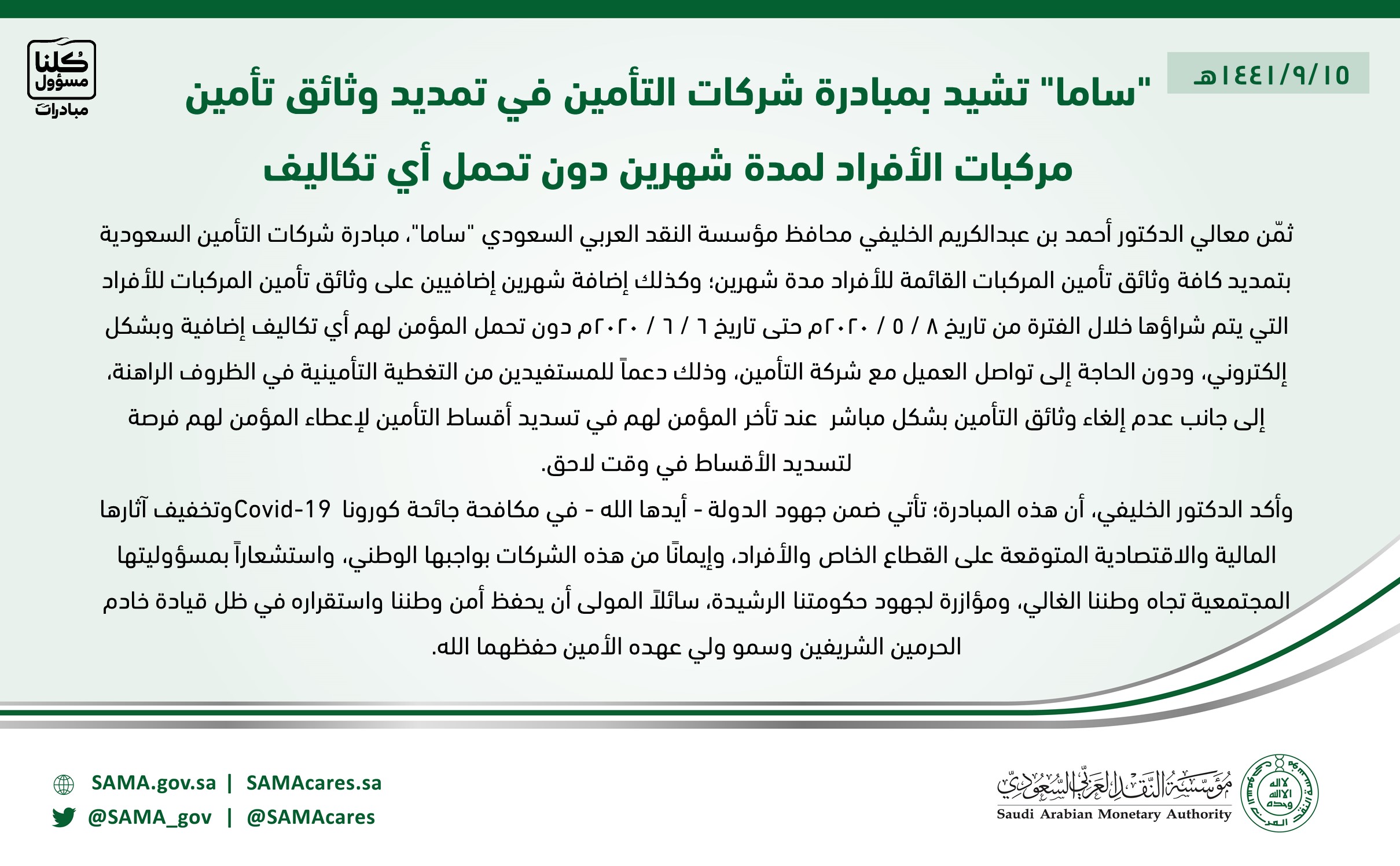 أخبار محلية > ساما” تشيد بمبادرة شركات التأمين في تمديد وثائق تأمين مركبات الأفراد لمدة شهرين دون تحمل أي تكاليف