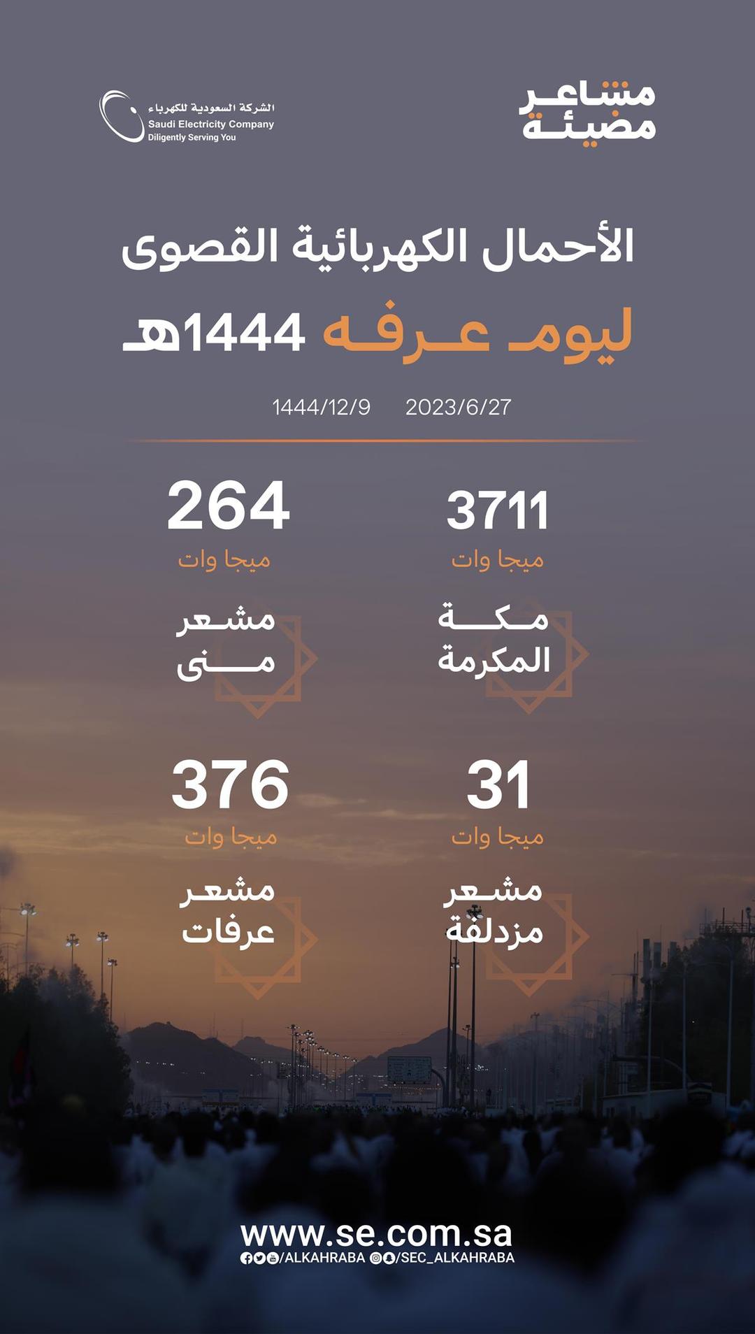 سجّلت الشركة السعودية للكهرباء أحمالا تاريخية في مشعر عرفات اليوم، حيث بلغت الأحمال الكهربائية القصوى ظهر اليوم 376 ميجا وات دون تسجيل أي انقطاعات مؤثرة، رغم ارتفاع الأحمال مقارنة بالعام الماضي، مشددة على موثوقية الخدمة وجاهزية فرق العمليات لمراقبة أداء الشبكة على مدار الساعة.