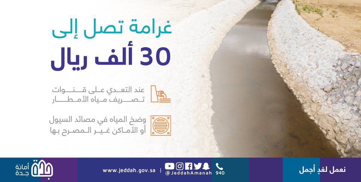 أعلنت أمانة محافظة جدة عن عقوبة التعدي على قنوات تصريف مياه الأمطار وضخ المياه في مصائد السيول أو الأماكن غير المصرح بها.