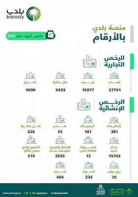 وأشارت إلى أن الأمانات والبلديات الفرعية التابعة لها أنهت خلال الأشهر الثلاثة الماضية (مارس، أبريل، مايو) إجراءات (119) ألف رخصة تجارية، ما بين إصدار جديد، تجديد، نقل ملكية، تعديل رخصة، وإلغاء رخصة تجارية، كما أنجزت الأمانات (20) ألف معاملة للرخص الإنشائية توزعت ما بين إصدار رخصة بناء جديد، وتجديد رخصة بناء، نقل ملكية، إضافة وتعديل مكونات بناء، تصحيح وضع مبنى قائم، إصدار رخصة تسوير، رخصة إتمام بناء، رخصة ترميم بناء، رخصة هدم، ومعاملات تسوية قطعة أرض.