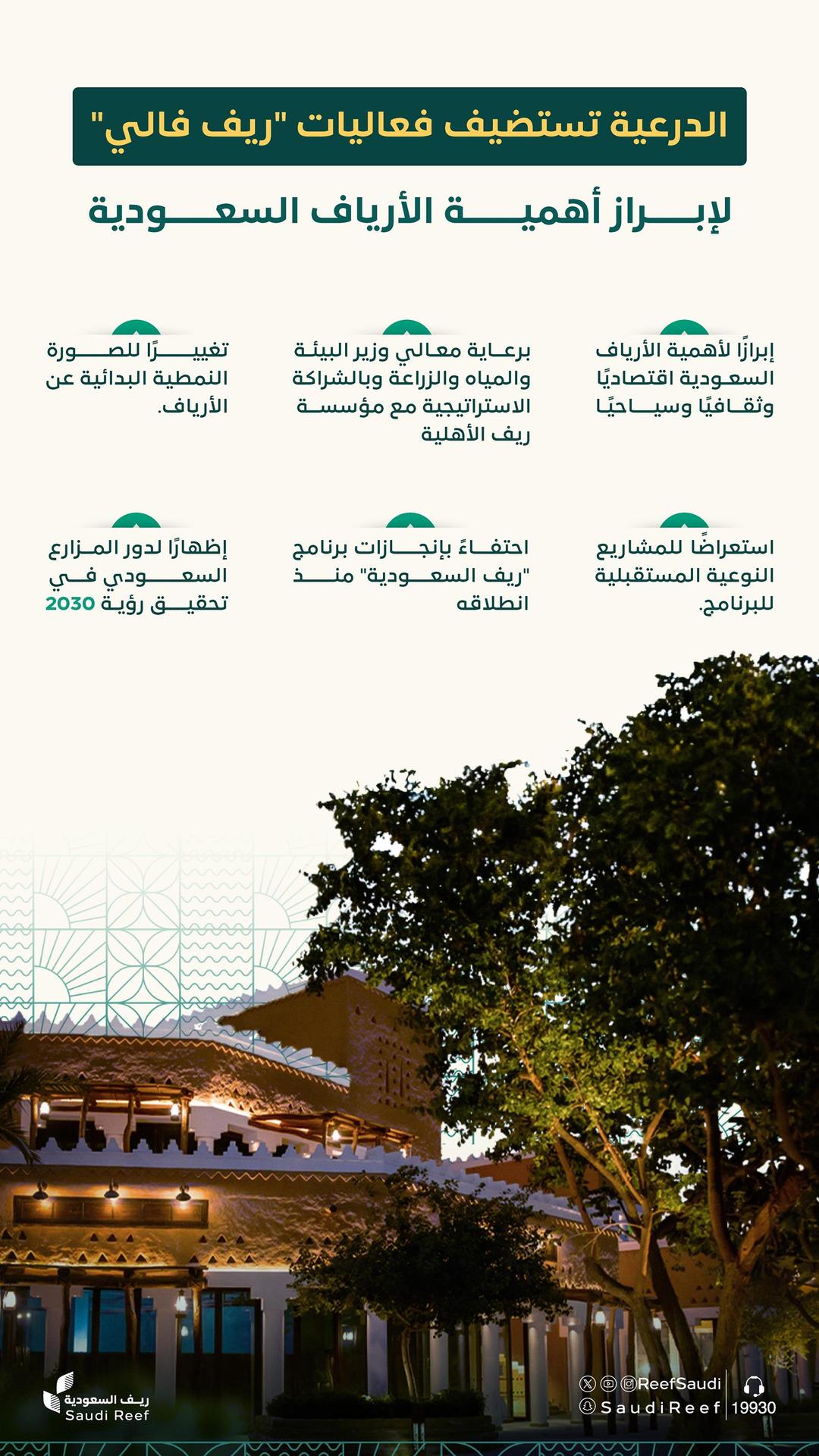 يُشار إلى أن برنامج التنمية الريفية الزراعية المستدامة “ريف السعودية”، يسعى إلى تحسين نمط الحياة في الأرياف السعودية، من خلال العمل على تنمية عدة قطاعات، مع التركيز على المناطق الريفية المُحددة، استنادًا إلى الميز النسبية للمناطق، وذلك من خلال تأهيل وتدريب الشباب في الريف، والإسهام في تطوير مشاريعهم وتحسين دخولهم، إلى جانب دعم مشاريع صغار المزارعين والمنتجين، والأسر الريفية المنتجة، وتعزيز مكانة المرأة في الريف.