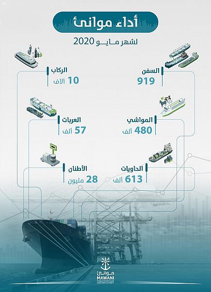 حققت الموانئ السعودية التي تشرف عليها الهيئة العامة للموانئ “موانئ” خلال شهر مايو لعام 2020م، ارتفاعاً في إجمالي أطنان البضائع المناولة، بواقع 28 مليون طن، بنسبة زيادة بلغت 6.36% وذلك مقارنة بالمدة المماثلة من العام السابق، فيما بلغ إجمالي أعداد الحاويات الصادرة والواردة 613 ألف حاوية.