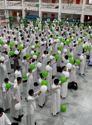 ‏من ساحة المدرسة التي اكتست باللون الأخضر والأبيض، رمزاً لألوان العلم السعودي،