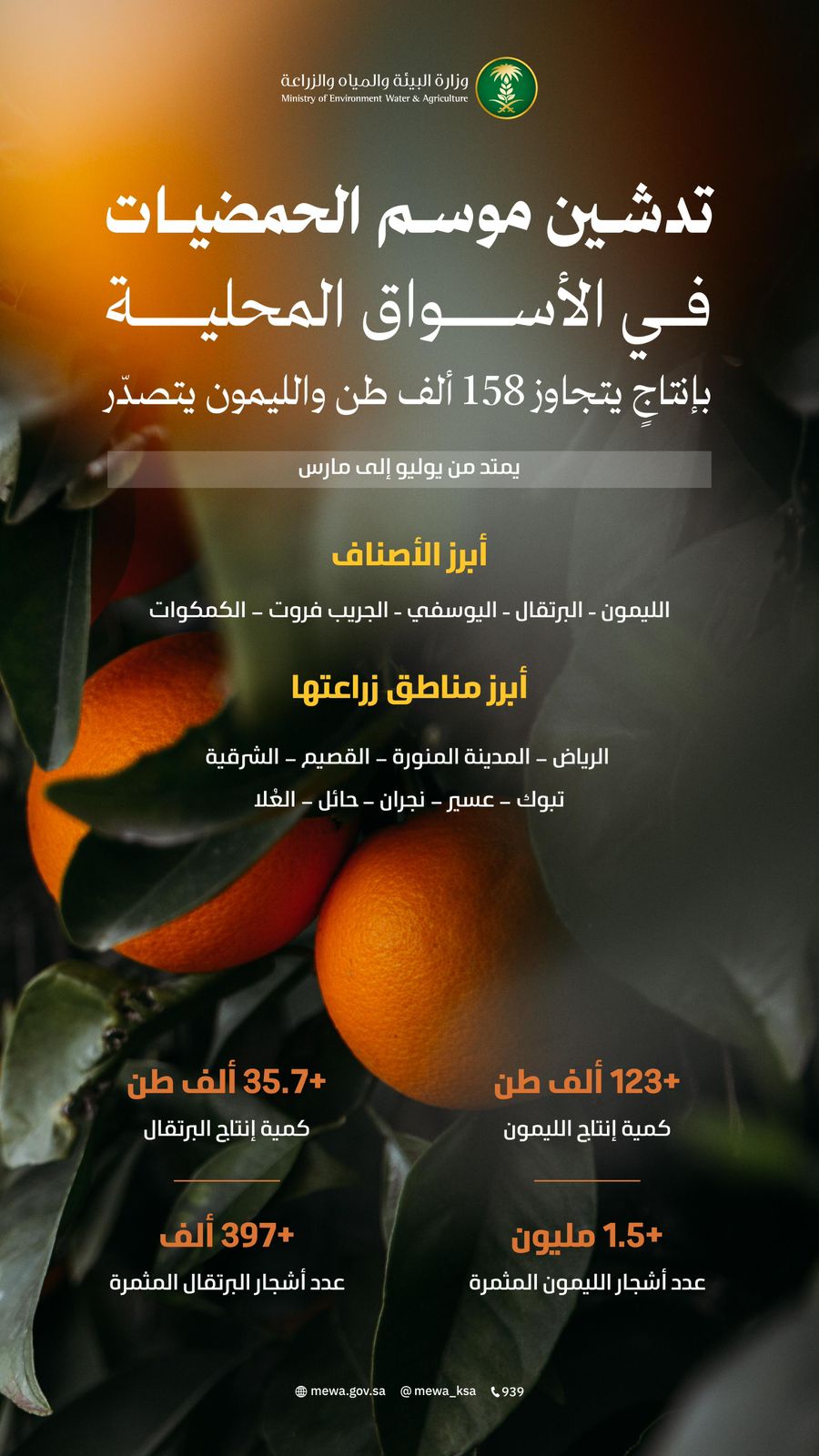 وأضافت الوزارة أن محصول الليمون يتصدر إنتاج الحمضيات في المملكة، بإجمالي إنتاج يتجاوز (123) ألف طن، وبعدد أشجار مثمرة يزيد على (1.5) مليون شجرة، يليه محصول البرتقال بإجمالي إنتاج يبلغ (35.7) ألف طن، وبعدد أشجار مثمرة يتجاوز (397) ألف شجرة، مفيدة بأن موسم إنتاج الحمضيات في المملكة يبدأ في شهر يوليو ويستمر حتى شهر مارس من كل عام.