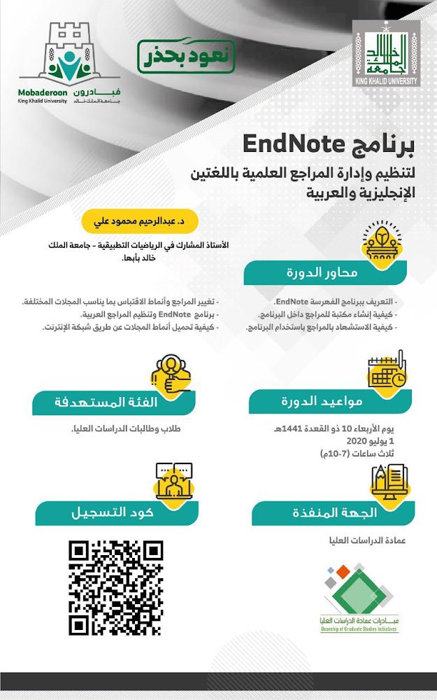 تنفذ جامعة الملك خالد ممثلة في عمادة الدراسات العليا، ضمن برنامج “مبادرون”، دورة بعنوان “برنامج EndNote لتنظيم وإدارة المراجع العلمية باللغتين الإنجليزية والعربية” لطلاب وطالبات الدراسات العليا بالجامعة، ويمكن التسجيل في الدورة من خلال الرابط: https://kkunow.zoom.us/webinar/register/WN_siZkSZ8rTfSOLr0yPrjXyA ، ويقدم الدورة الأستاذ المشارك في الرياضيات التطبيقية بالجامعة الدكتور عبد الرحيم محمود علي، وذلك عن بُعد، مساء الأربعاء القادم.