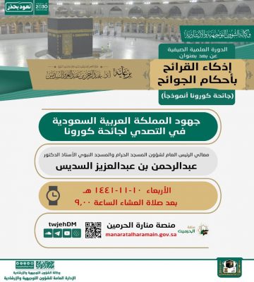 يفتتح معالي الرئيس العام لشؤون المسجد الحرام والمسجد النبوي الشيخ الأستاذ الدكتور / عبدالرحمن بن عبدالعزيز السديس – اليوم الأربعاء ١٤٤١/١١/١٠هـ بعد صلاة العشاء، الدورة العلمية الصيفية عن بعد والتي عنوانها ” إذكاء القرائح بأحكام الجوائح ” ، والتي تبدأ بمحاضرة لمعالي الرئيس العام عنوانها ” جهود المملكة العربية السعودية في التصدي لجائحة كورونا “.