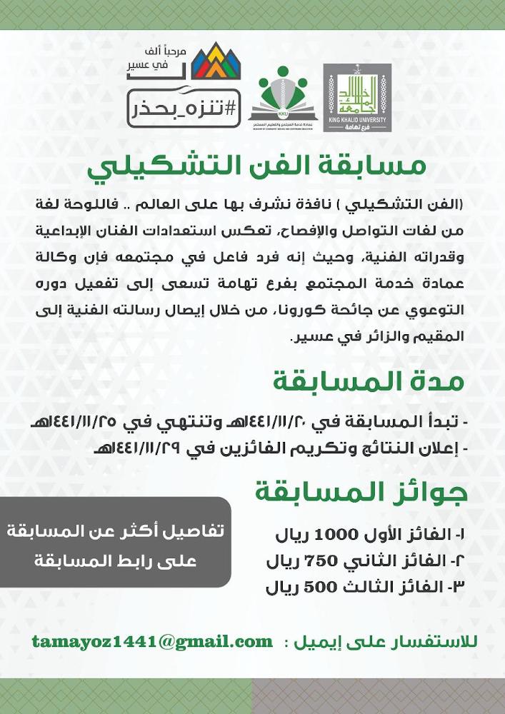 أعلن فرع جامعة الملك خالد بتهامة، بالتعاون مع عمادة خدمة المجتمع والتعليم المستمر، إطلاق مسابقة الفن التشكيلي، وذلك خلال الفترة من ٢٠ – ٢٥ ذي القعدة الجاري، ضمن فعاليات مبادرة “حسن الوِفادة”، التي انطلقت في نسختها الثانية تحت شعار “تنزه بحذر”.