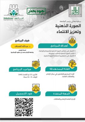 تنظم جامعة الملك خالد ممثلة في الإدارة العامة للإعلام والعلاقات برنامجًا إلكترونيًّا مجانيًّا موجهًا للجنسين ضمن مشروع “مبادرون” بعنوان “الصورة الذهنية وتعزيز الانتماء”.