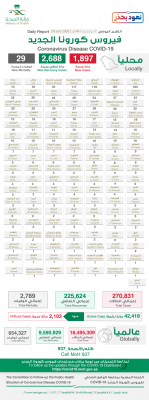 أعلنت وزارة #الصحة⁩ اليوم عن تسجيل (1897) حالة إصابة جديدة بفيروس ⁧#كورونا⁩ الجديد (كوفيد19)، وتسجيل (29) حالات وفيات رحمهم الله، وتسجيل (2688) حالة تعافي ليصبح إجمالي عدد الحالات المتعافية (225,624) حالة ولله الحمد.