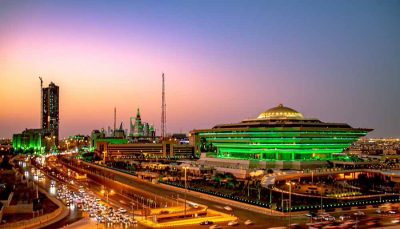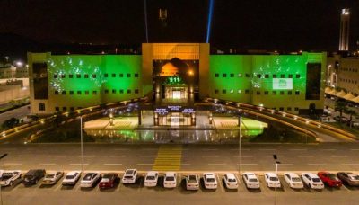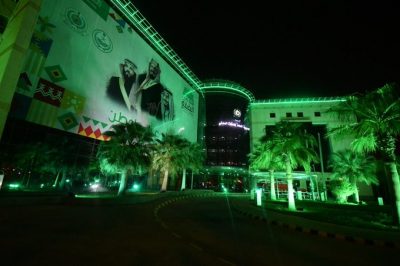 كما ازدانت بالإضاءات الخضراء واكتست بالعديد من صور المؤسس الملك عبدالعزيز بن عبدالرحمن الفيصل آل سعود ـ طيب الله ثراه ـ، وبصور خادم الحرمين الشريفين الملك سلمان بن عبدالعزيز آل سعود و صاحب السمو الملكي الأمير محمد بن سلمان بن عبدالعزيز آل سعود ولي العهد نائب رئيس مجلس الوزراء وزير الدفاع ـ حفظهما الله ـ، احتفاءً وابتهاجاً باليوم الوطني الـ ” 90 ” لتوحيد المملكة العربية السعودية، وتطرزت اللافتات الكبيرة على المباني وعلى المداخل الرئيسية بعبارة “همة حتى القمة”.