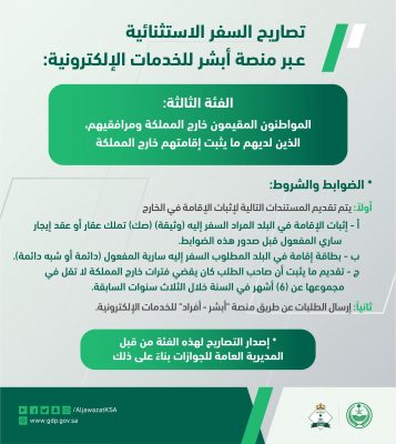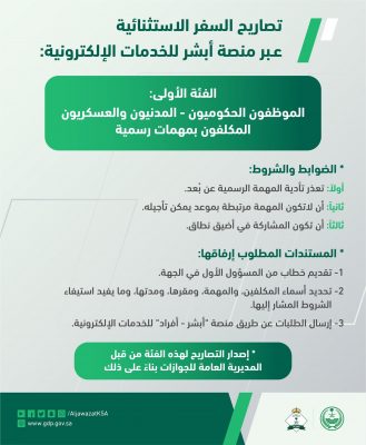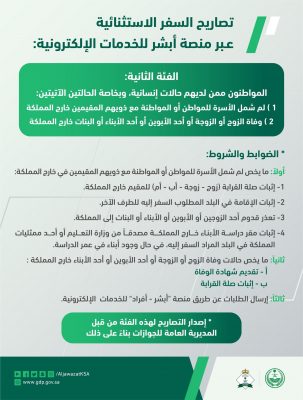 وأكدت المديرية العامة للجوازات أن خدمة إرسال الطلبات متاحة عن طريق منصة “أبشر – أفراد” للخدمات الإلكترونية، وأن إصدار التصاريح لهذه الفئات يتم من قبل وزارة الداخلية ممثلة بالمديرية العامة للجوازات وفقاً للضوابط والشروط المشار إليها.