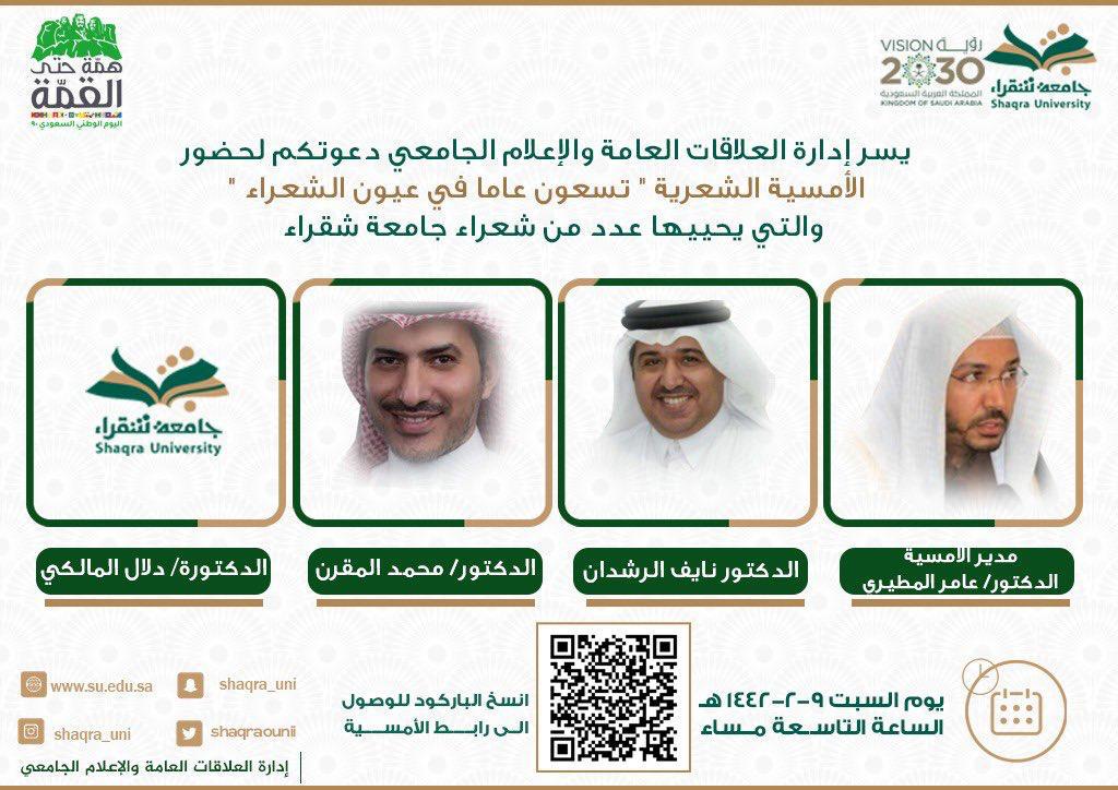 احتفالا باليوم الوطني ال90 نظمت إدارة العلاقات العامة والإعلام بجامعة شقراء أمسية شعرية بعنوان” تسعون عاما في عيون الشعراء” أحياها نُخبة من شعراء جامعة شقراء هم :