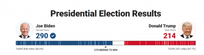أعلنت شبكة فوكس نيوز الأمريكية، فوز المرشح الديمقراطي جو بايدن برئاسة الولايات المتحدة الأمريكية، بمجموع 290 صوتا للمجمع الانتخابي.