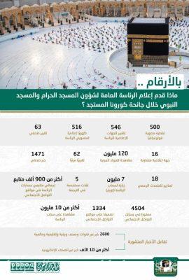 وصل عدد زيارات حساب الرئاسة العامة لشؤون المسجد الحرام والمسجد النبوي بتويتر أكثر من (٧) مليون زيارة، وشاهد (١٠) مليون مشاهد المحتوى عبر تطبيق (سناب شات)، كما بلغ عدد متابعي حسابات الرئاسة بمواقع التواصل الاجتماعي أكثر من (٩) آلاف، وقد نشرت عبر مختلف المنصات قرابة (٧٠٠٠) منشورًا وتصميماً.