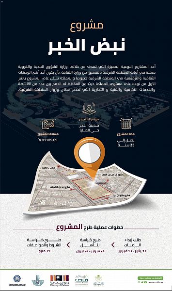 يشار أن مشروع “نبض الخبر” يمثل انطلاقة العمل التكاملي بين الجهات لتطوير المواقع المتاحة بالمنطقة الشرقية، ينطلق بالشراكة بين وزارة الشؤون البلدية والقروية، ووزارة الثقافة، وهيئة تطوير المنطقة الشرقية، وأمانة المنطقة الشرقية، ووزارة السياحة، وعدد من البرامج منها برنامج جودة الحياة.