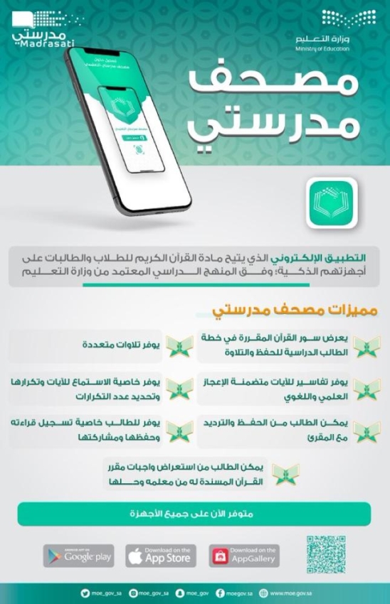 أعلنت وزارة التعليم اليوم السبت إطلاق التطبيق الإلكتروني الذي يتيح مادة القرآن الكريم للطلاب والطالبات على أجهزتهم الذكية، وفق المنهج الدراسي المعتمد من الوزارة.