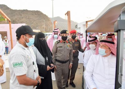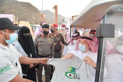 واستمع سمو أمير منطقة جازان لشرح من قبل رئيس الفريق عبدالله بن إبراهيم عكور ومشرفة مشاة الداير الأستاذة خيرية الفيفي عما يعرضه فريق مشاة جازان في الركن من اللوحات التعريفية بالمشي والأكل الصحي والمجسمات التي توضح فوائد المشي ونشر ثقافته والتعريف بالفريق والأنشطة والبرامج التي نفذها على مستوى منطقة جازان مسلما سموه تشيرت الفريق ونوه سمو بجودة وأهمية رياضة المشي على الصحة العامة.