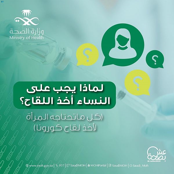 أصدرت الصحة دليلاً توعوياً شاملاً عن أهمية أخذ النساء للقاح من فيروس كورونا تحت عنوان (لماذا يجب على النساء أخذ اللقاح) حيث يهدف للتوعية وتشجيع النساء على أخذ اللقاح، ويجيب عن أهم الاستفسارات والشائعات المتداولة ويتضمن الطرق السليمة والصحيحة لأخذ اللقاح .