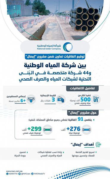 أعلنت شركة المياه الوطنية، اليوم، إبرامها لأول مرة 91 اتفاقية لتنفيذ أكثر من 500 ألف توصيلة مياه وصرف صحي بتكلفة تقارب ثلاث مليارات ريال، سيستفيد منها أكثر من 6 ملايين شخص، ضمن مشروع إيصال الذي أعلنت عنه في ديسمبر الماضي.