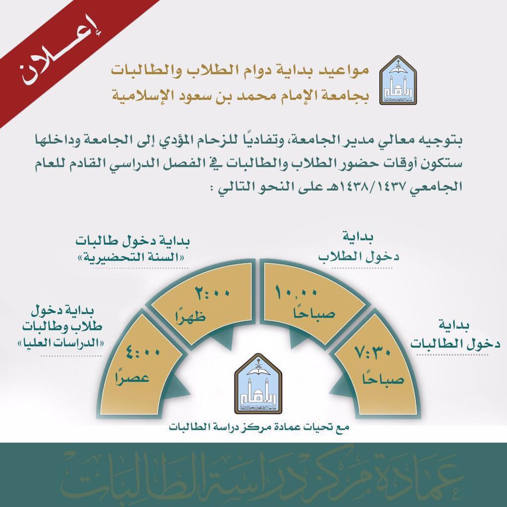 عمدت جامعة الإمام محمد بن سعود الإسلامية إلى تغيير ساعات الدوام الدراسي للطلاب والطالبات والدراسات العليا وطالبات السنة التحضيرية، نظراً لما تشهده الطرق المحيطة بالجامعة من مشروعات، أدت إلى زيادة احتمال حدوث اختناقات مرورية متكررة ومؤثرة على انتظام الطلاب والطالبات في دراستهم.وطرأ التغيير في ساعات الدوام الدراسي للفصل الأول من هذا العام بحسب ما خلص إليه الاجتماع الذي عقدته إدارة الجامعة اليوم، في مقرها بالرياض، على الدوام في مدينة الملك عبدالله للطالبات الذي تقرر أن يبدأ في تمام الساعة السابعة والنصف صباحاً في الكليات كافة، وفي جميع مستويات الدراسة في مرحلة البكالوريوس، ما عدا دوام طالبات المسارات التحضيرية، حيث سيبدأ في تمام الساعة الثانية بعد الظهر، فيما يبدأ دوام الطلاب في جميع كليات الجامعة في تمام الساعة العاشرة صباحاً، في حين يبدأ دوام الدراسات العليا للجنسين في جميع كليات الجامعة في تمام الساعة الرابعة عصراً، بينما يظل دوام الموظفين والموظفات مستمراً على ما تنص عليه الأنظمة والتعليمات دون أي تغيير.