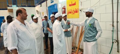 تفقد مدير عام فرع وزارة البيئة والمياه والزراعة بمنطقة عسير المهندس عبدالله الويمني صباح اليوم سير العمل في مسلخ أبها النموذجي برفقة مدير إدارة الأسواق والمسالخ الدكتور جابر حمزة عسيري وطاقم العمل المكلف من قسم الأسواق والمسالخ بمكتب الوزارة بأبها, حرص من خلالها على التأكد من العمل وفق التعليمات والأنظمة التي تم التعميم بها مؤخرا, والتقيد بالزي الموحد المعتمد, إضافة الى تطبيق معايير السلامة والنظافة خصوصا في أماكن الذبح, والتأكد من وجود عدد كاف من الأطباء البيطريين والجزارين.