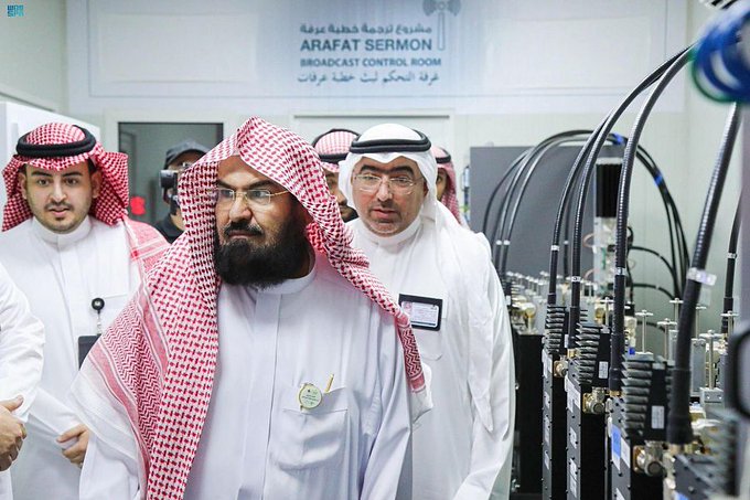 تفقد معالي الرئيس العام لشؤون المسجد الحرام والمسجد النبوي الشيخ الدكتور عبدالرحمن بن عبدالعزيز السديس اليوم, مقر مشروع خادم الحرمين الشريفين للترجمة الفورية بخطبة يوم عرفة في مشعر عرفات، وذلك للتأكد من جاهزية الموقع.