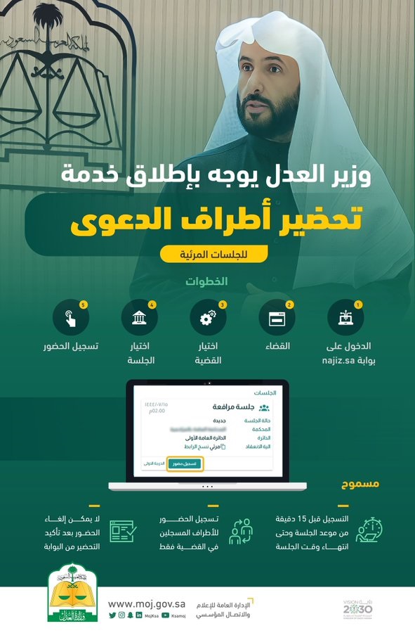 وبيّنت الوزارة أنه يمكن تسجيل الحضور للجلسة قبل موعد انعقادها بـ15 دقيقة، ولن يُسمح بالدخول قبل هذه الفترة، كما يمكن تسجيل الحضور للأطراف المسجلين في القضية، ولا يمكن إلغاء الحضور بعد تأكيد التحضير عبر بوابة “ناجز”.