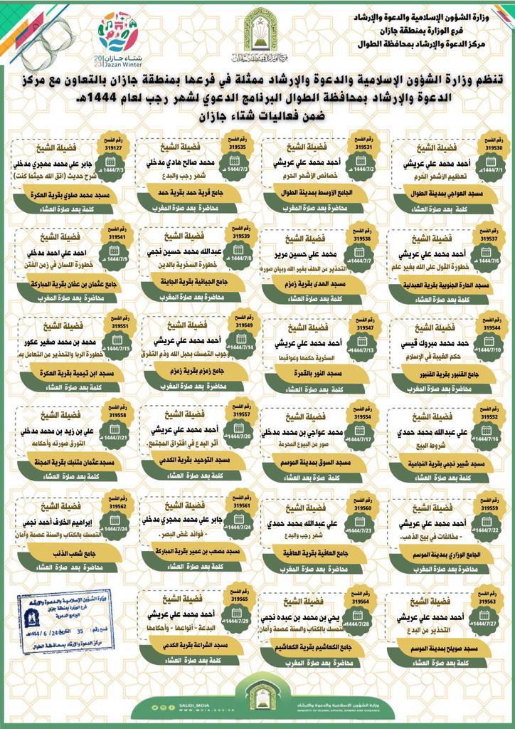 يطلق فرع وزارة الشؤون الإسلامية والدعوة والإرشاد في منطقة جازان ممثلاً بمركز دعوة محافظة الطوال حزمة من البرامج والمناشط الدعوية لشهر رجب من العام الجاري والتي تبلغ أكثر من ٢٢ منشطاً دعوية ما بين محاضرات وندوات وكلمات ودروس تبين عدد من المواضيع المهمة التي تهم الشارع .