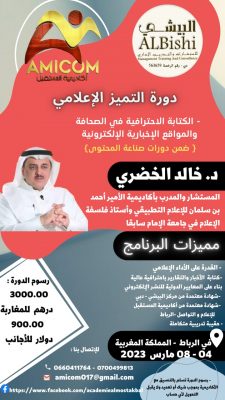 تقدم أكاديمية المستقبل للإعلام والتواصل بالرباط ومركز البيشي للاستشارات والتدريب الإداري بدبي دورة تدريبية بعنوان: “دورة التميز الإعلامي”، للمدرب الخبير الإعلامي الدكتور خالد الخضري المستشار والمدرب السابق في أكاديمية الأمير أحمد بن سلمان للإعلام التطبيقي، وأستاذ فلسفة الإعلام في جامعة الإمام سابقا بالمملكة العربية السعودية.