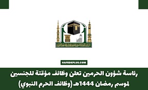 أعلنت وكالة الرئاسة العامة لشؤون المسجد النبوي ممثلة في الإدارة العامة للموارد البشرية عن توفر وظائف مؤقتة للسعوديين والسعوديات، للعمل بالمسجد الحرام، والمسجد النبوي خلال موسم رمضان لهذا العام 1444هـ.
