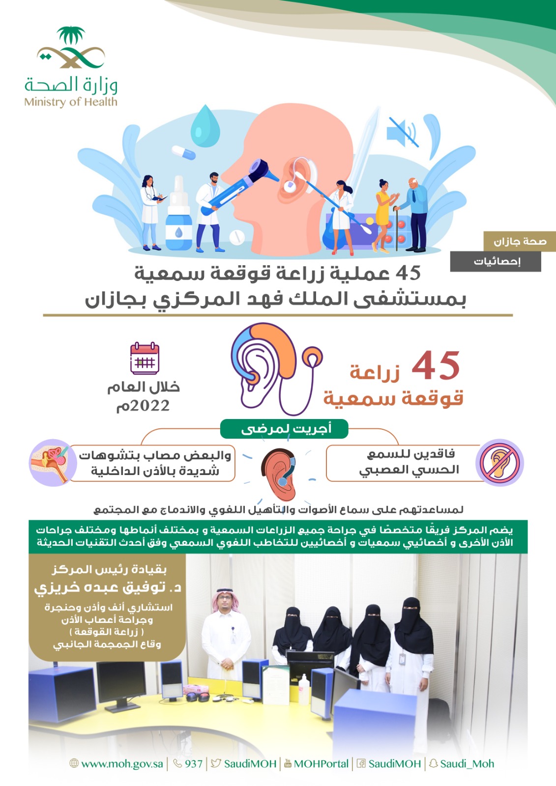 أجرى مركز زراعة القوقعة السمعية بمستشفى الملك فهد المركزي بجازان 45 زراعة قوقعة سمعية خلال العام 2022م.