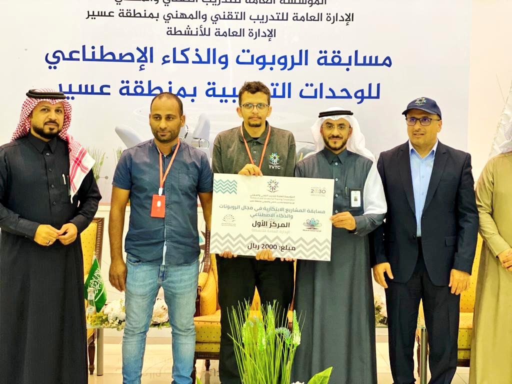 توج مدير عام التدريب التقني والمهني بمنطقة عسير الدكتور سليمان الحفظي وبحضور مدير عام التعليم بمنطقة عسير الدكتور أحمد العمري متدربي الكلية التقنية بأبها بالمراكز الأولى والثانية في المسابقة التي أقامتها الإدارة العامة للتدريب التقني والمهني بمنطقة عسير صباح اليوم الأربعاء للمشاريع الابتكارية في مجال الروبوتات والذكاء الاصطناعي شارك فيها 14 منشأة تدريبية بمعدل ما يقارب 26مشروعا .