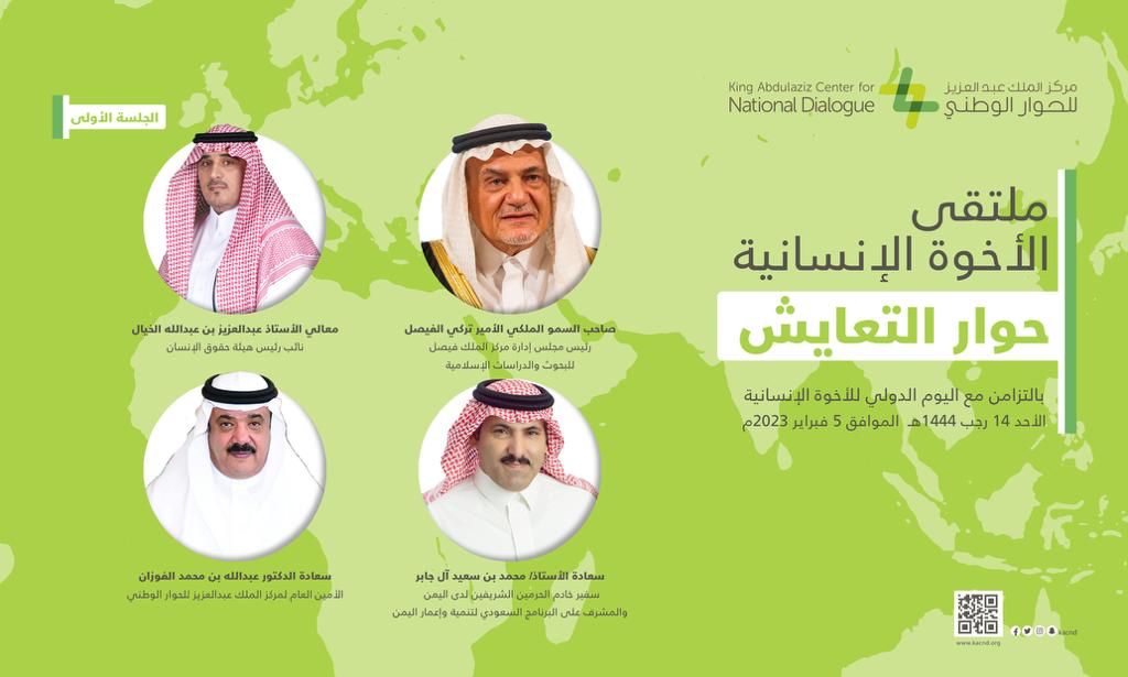 يستضيف مركز الملك عبد العزيز للحوار الوطني يوم الأحد 14 رجب 1444هـ الموافق 5 فبراير 2023م، في مقره بالرياض عددا من أصحاب السمو الملكي والمعالي والسعادة الذين يستعرضون جهود المملكة في تعزيز الأخوة الإنسانية، وذلك ضمن الملتقى الذي ينظمه بعنوان: “الأخوة الإنسانية.. حوار التعايش 2023م”.