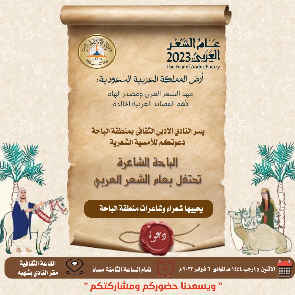 تحتفي منطقة الباحة الشاعرة بعام الشعر العربي بمشاركة عدد من شعراء وشاعرات منطقة الباحة وذلك مساء يوم الاثنين 15 من الشهر الجاري الموافق 6 فبراير بالقاعة الثقافية بمقر النادي الأدبي الثقافي بشهبة.
