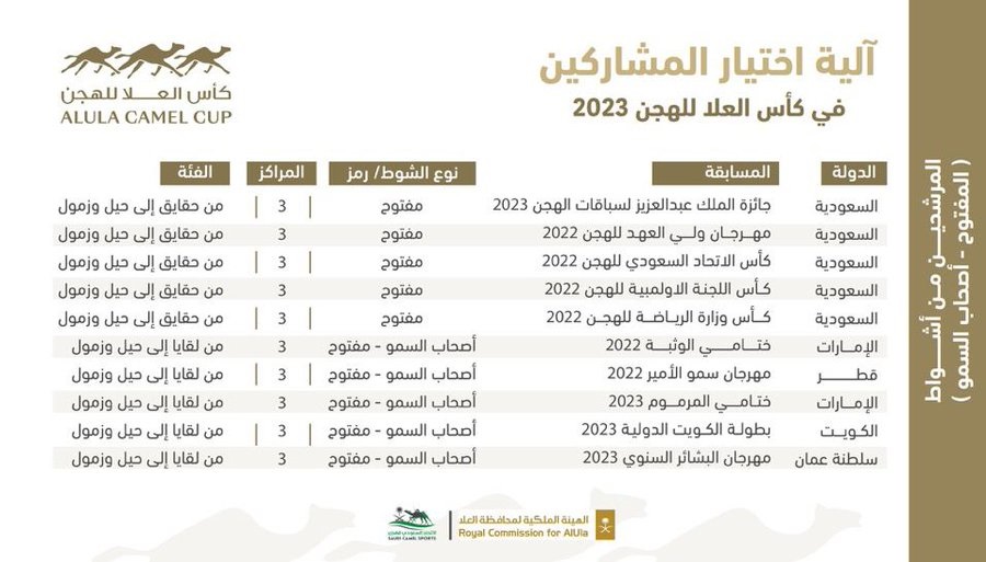 وبينت اللجنة أنه يشترط للمشاركة أن تكون من أصحاب المراكز الثلاثة في أشواط الرموز في كل من “جائزة الملك عبدالعزيز لسباقات الهجن 2023، مهرجان ولي العهد للهجن 2022، كأس الاتحاد السعودي للهجن 2022، كأس اللجنة الأولمبية للهجن 2022، وكأس وزارة الرياض للهجن 2022 ( السعودية ) ، جائزة زايد الكبرى 2022، وختامي الوثبة 2022، وختامي المرموم 2023 (الإمارات) مهرجان المؤسس 2022، ومهرجان سمو الأمير 2022، مهرجان الأمير الوالد 2023 ( قطر ) من لقايا وحقايق إلى حيل وزمول, مهرجان البشائر السنوي 2023 ( سلطنة عمان ) ، بطولة الكويت الدولية 2023 من حقايق إلى حيل وزمول.