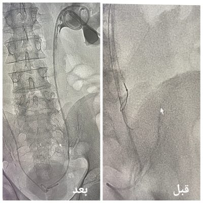 وبعد الفحص وإجراء كل التحاليل الطبية اللازمة، ومنها الإشعاعية؛ تبين وجود انغلاق في الحالب، مما استدعى تدخل فريق الأشعة التداخلية.
