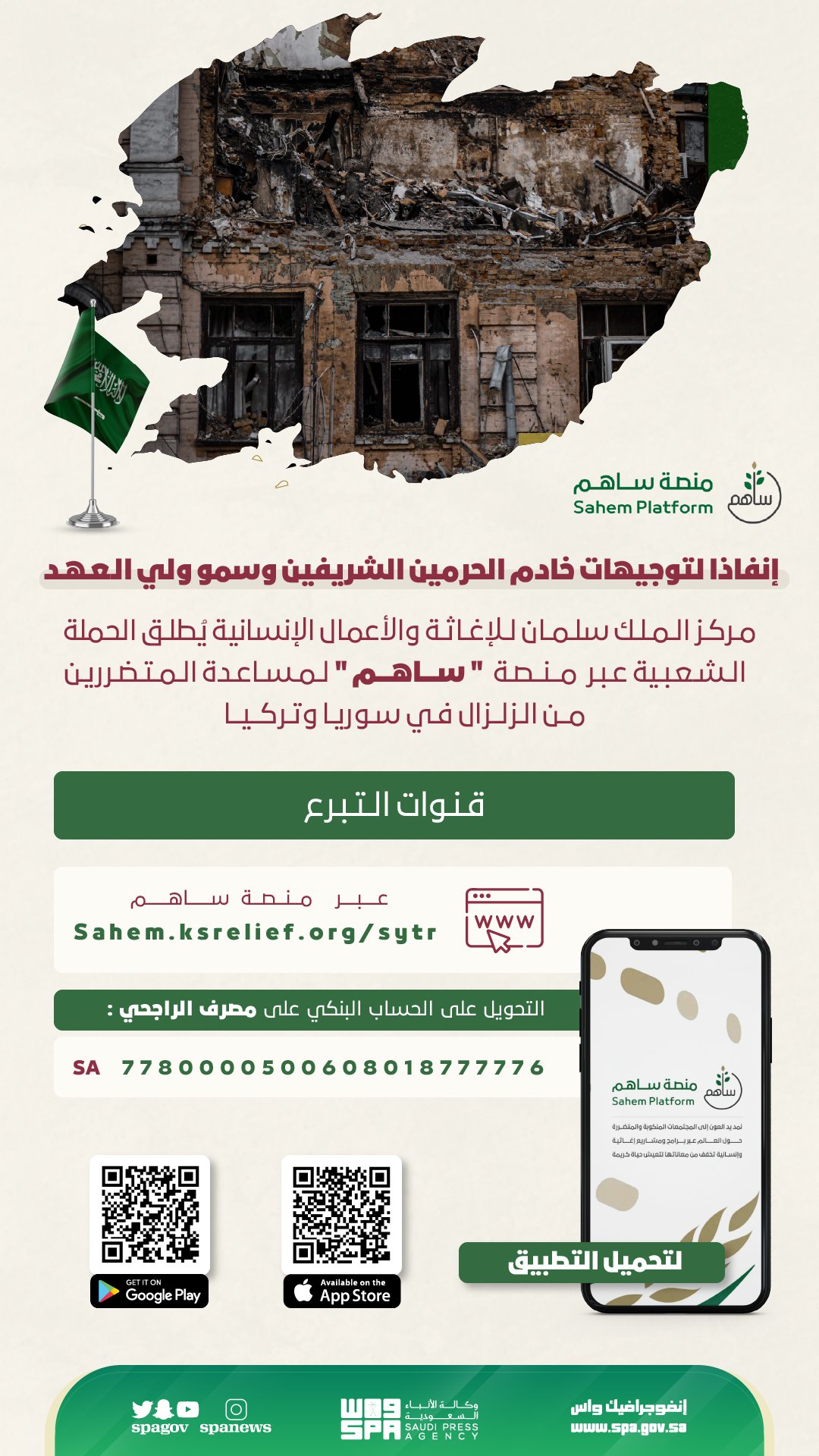 إنفاذا لتوجيهات #خادم_الحرمين_الشريفين وسمو #ولي_العهد.. مركز الملك سلمان للإغاثة يُطلق الحملة الشعبية عبر منصة “ساهم” لمساعدة المتضررين من الزلزال في سوريا وتركيا