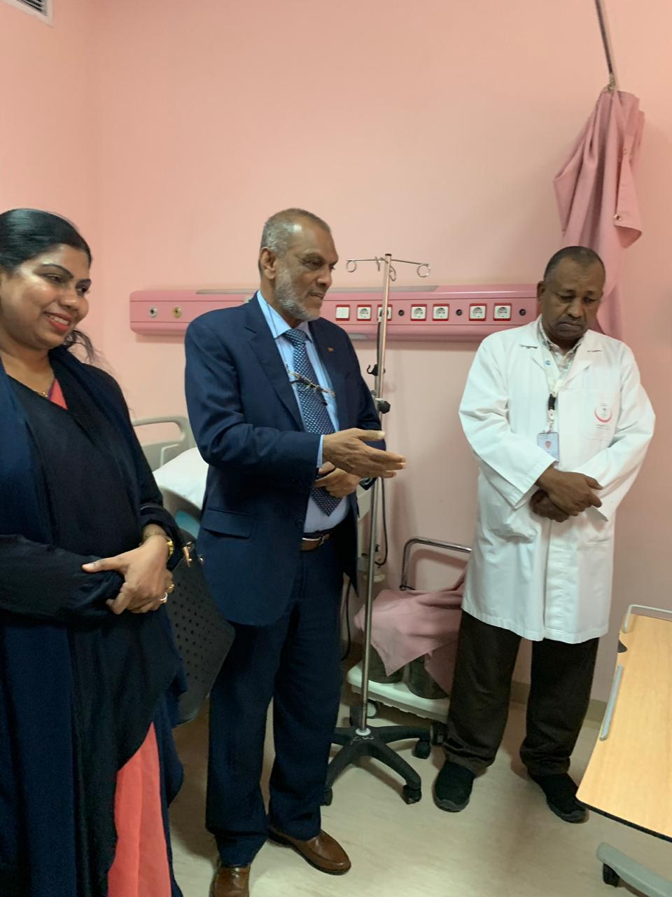حيث زار المرضى المنومين للإطمئنان عليهم وتقديم الهدايا لهم وتم التباحث مع سعادته لارسال المرضى بعد استكمال علاجهم الى بلادهم .