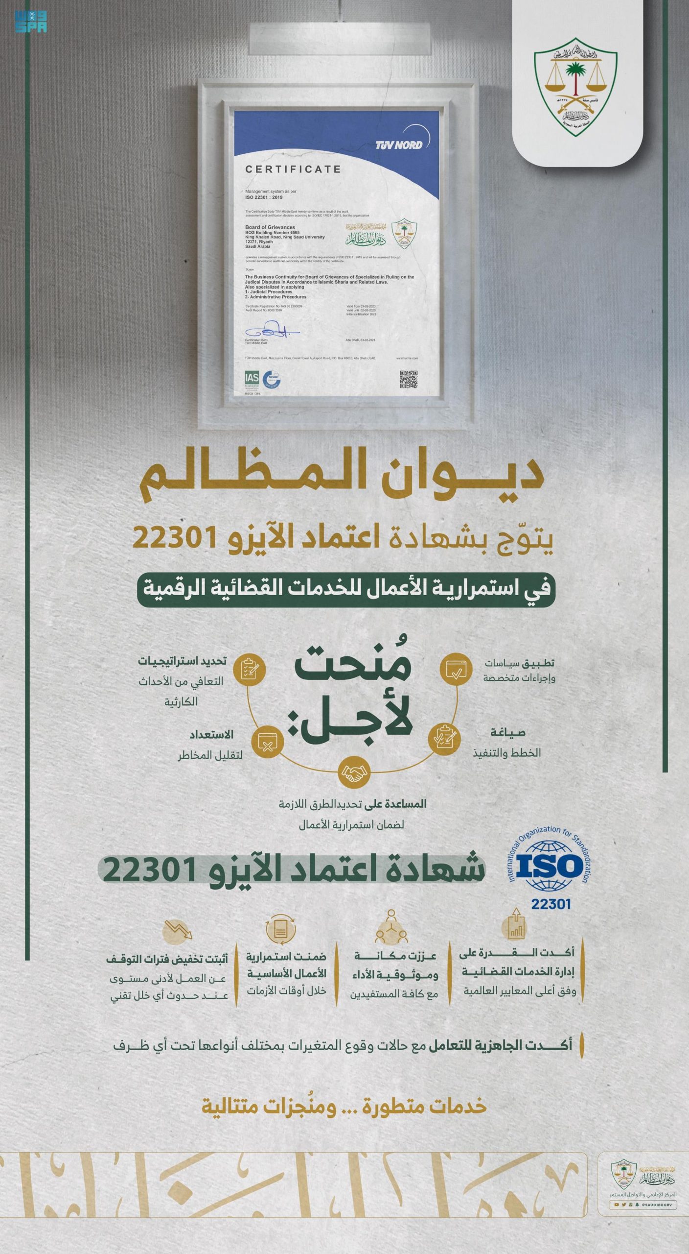 تُوّج ديوان المظالم بشهادة الآيزو العالمية (ISO 22301 2019) في إدارة واستمرارية الأعمال القضائية الرقمية، بعد إتمام كافة متطلبات الآيزو ومايتعلق باستمرارية الأعمال في ظل المتغيرات والأزمات.