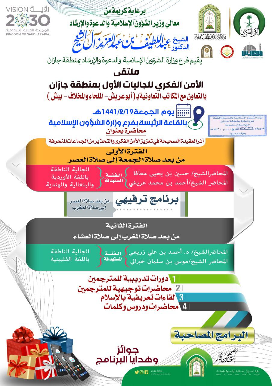 ويتكون البرنامج من ندوتين بعنوان (أثر العقيدة الصحيحة في تعزيز الأمن الفكري والتحذير من الجماعات المنحرفة ) يلقيها فضيلة الشيخ حسين بن يحيى معافا وفضيلة الشيخ أحمد بن محمد عريشي من بعد صلاة الجمعة إلى صلاة العصر للجالية الناطقة باللغة الأوردية واللغة البنغالية والهندية ، وبذات العنوان يلقيها فضيلة الشيخ موسى بن سلمان خبراني مساعد مدير عام فرع وزارة الشؤون الإسلامية والدعوة والإرشاد في منطقة جازان وفضيلة الشيخ الدكتور أحمد بن على الزريعي مدير مركز الدعوة في منطقة جازان وتكون من بعد صلاة المغرب إلى صلاة العشاء للجالية الفلبينية .