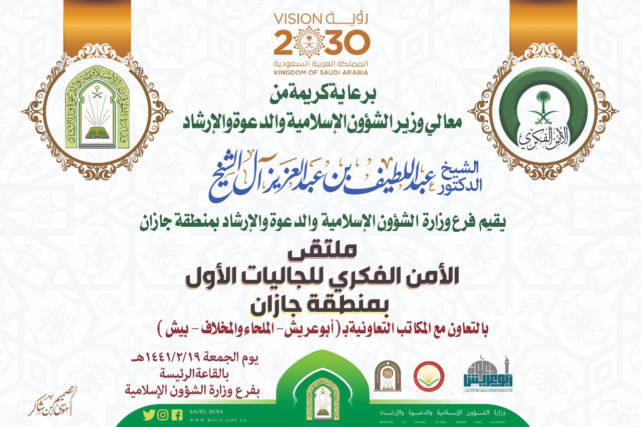 برعاية معالي وزير الشؤون الإسلامية والدعوة والإرشاد الشيخ الدكتور عبداللطيف بن عبدالعزيز آل الشيخ، ينظم فرع الوزارة بمنطقة جازان اليوم الجمعة ملتقى الأمن الفكري الأول للجاليات بمنطقة جازان، ضمن برامج ومناشط الفرع الدعوية والإرشادية في مجال الأمن الفكري الموجهة لمختلف شرائح المجتمع .