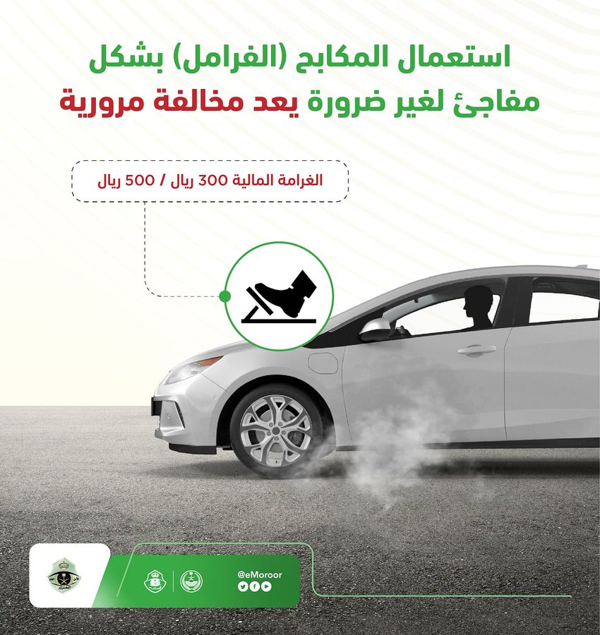 أكّد الإدارة العامة للمرور، أن استخدام المكابح “الفرامل” بشكلٍ مفاجئ لغير الضرورة يعد مخالفة مرورية تستحق غرامة وقدرها من 300 إلى 500 ريال.