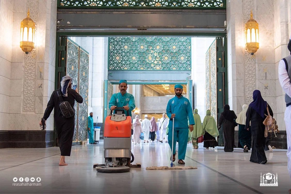 وتكثّف الوكالة عمليات النظافة والتعقيم والتعطير على مدار الساعة مع التأكّد من تشغيل مشربيات ماء زمزم المبارك وتأمين الحافظات وتجهيز الأبواب وتأمين السجاد في المصليات كافة وغسل جميع المسطحات بالتوسعة بأدوارها المتعدّدة، كذلك تخصيص فرق لمتابعة تشغيل السلالم الكهربائية والمصاعد الخدمية وأنظمة الإضاءة الداخلية والخارجية للتأكّد من وضوح الأنظمة الصوتية وتشغيل نظام التكييف وفق معايير تراعي دراجة حرار الجو، ونقاء الهواء.