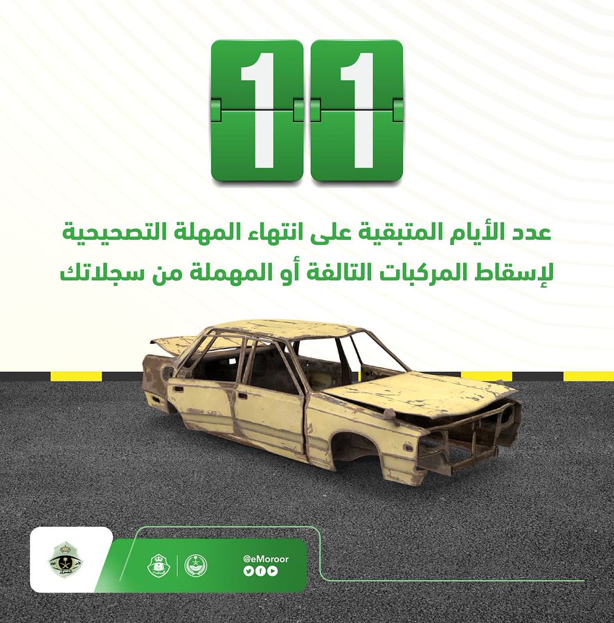 دعا المرور السعودي إلى المسارعة في الاستفادة من المهلة التصحيحية لإسقاط المركبات التالفة أو المهملة من سجلاتك.