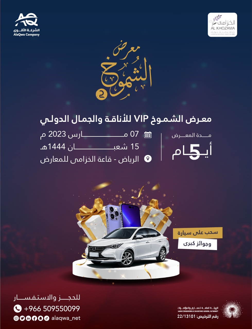 ينطلق في العاصمة الرياض معرض الشموخ للأناقة والجمال الدولي من 7 الى 11 مارس 2023 م القادم والذي يحتضنه قاعة الخزامى بتنظيم من الشركة الرائدة التي تطمح لتغيير جميع المفاهيم في مجالها بمهنيةٍ وكفاءة عالية وجودةٍ مستدامة وهي (الشركة الأقوى) للدعاية والإعلان و العلاقات العامة وتنظيم المعارض والمؤتمرات .