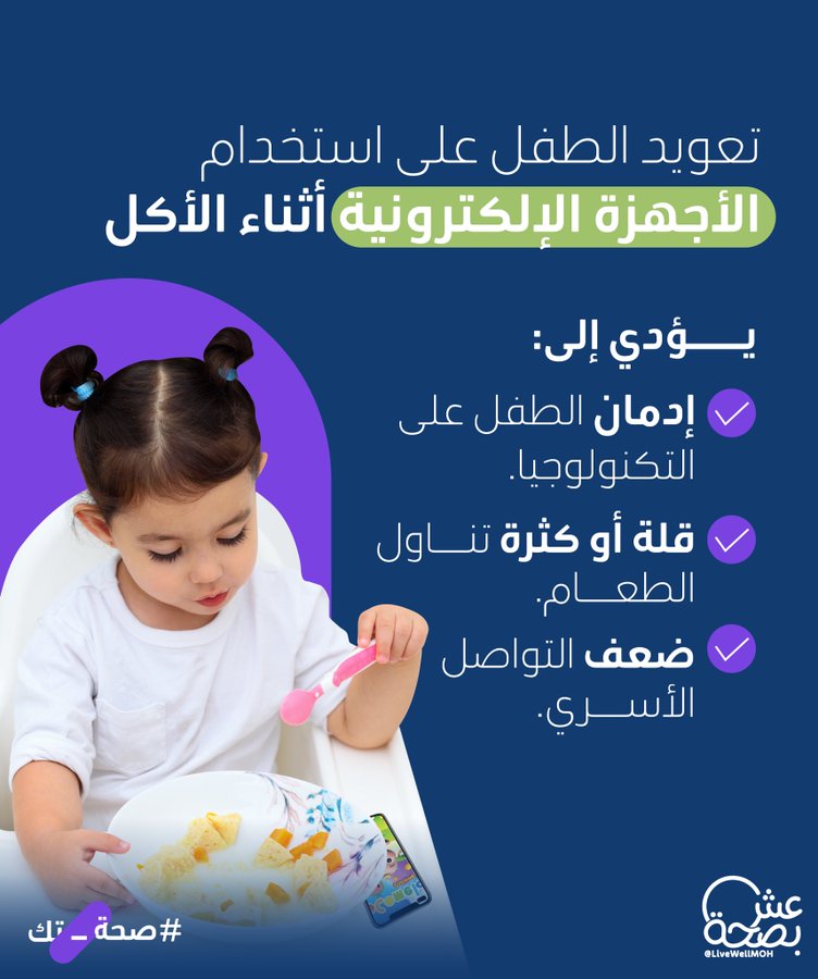 وأوضحت الوزارة، عبر حساب منصتها التوعوية “عش بصحة” على “تويتر”، أن تعويد الطفل على الأجهزة الإلكترونية أثناء الأكل يؤدي إلى إدمان الطفل للتكنولوجيا، وقلة أو كثرة تناول الطعام، وضعف التواصل الأسري”.