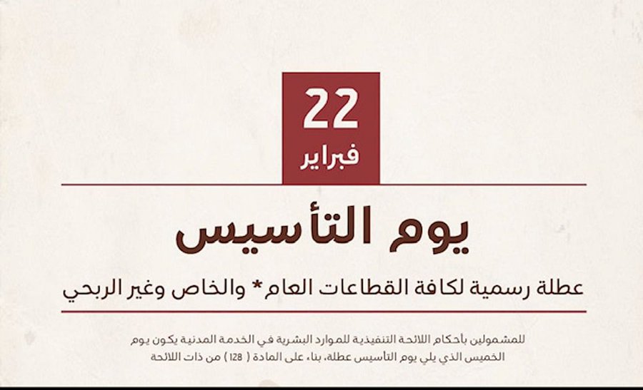 تبدأ مع نهاية دوام اليوم الثلاثاء، إجازة يوم التأسيس لجميع موظفي الدولة، وهي ذاتها الإجازة الأخيرة للطلاب والطالبات والمعلمين والمعلمات للفصل الدراسي الثاني لهذا العام التي ستكون يومَي الأربعاء والخميس، إضافة إلى الإجازة الأسبوعية الجمعة والسبت.
